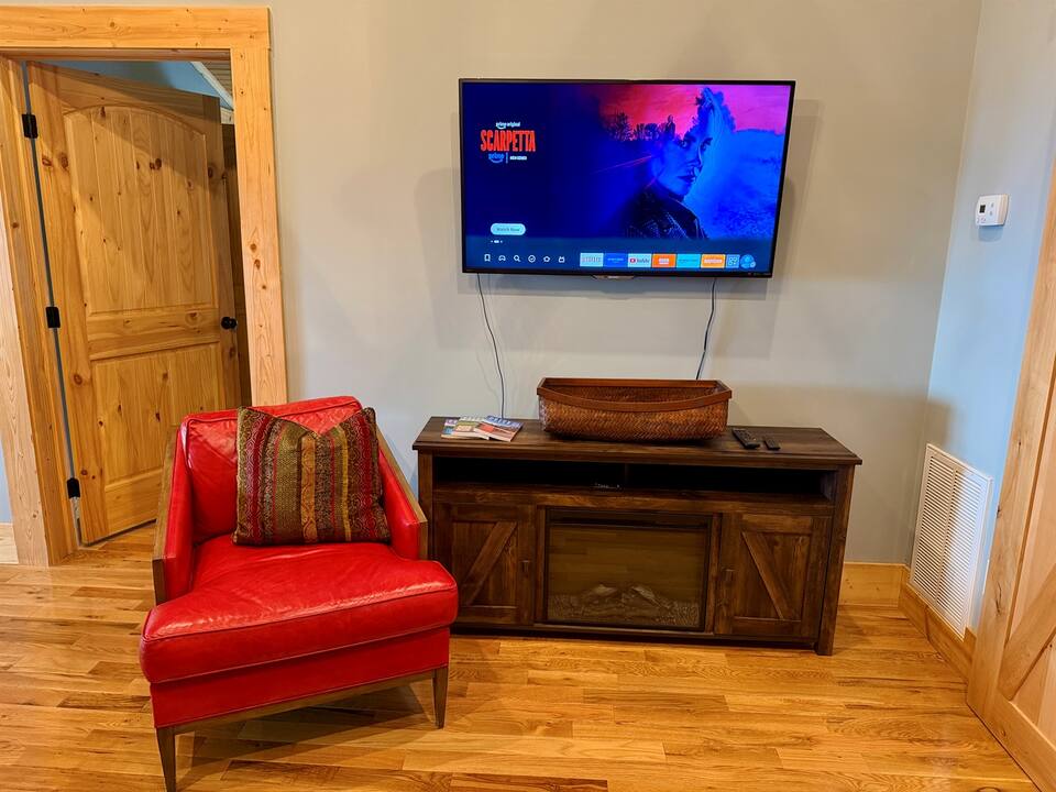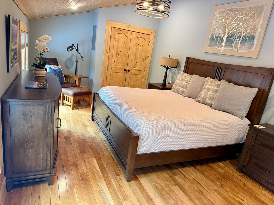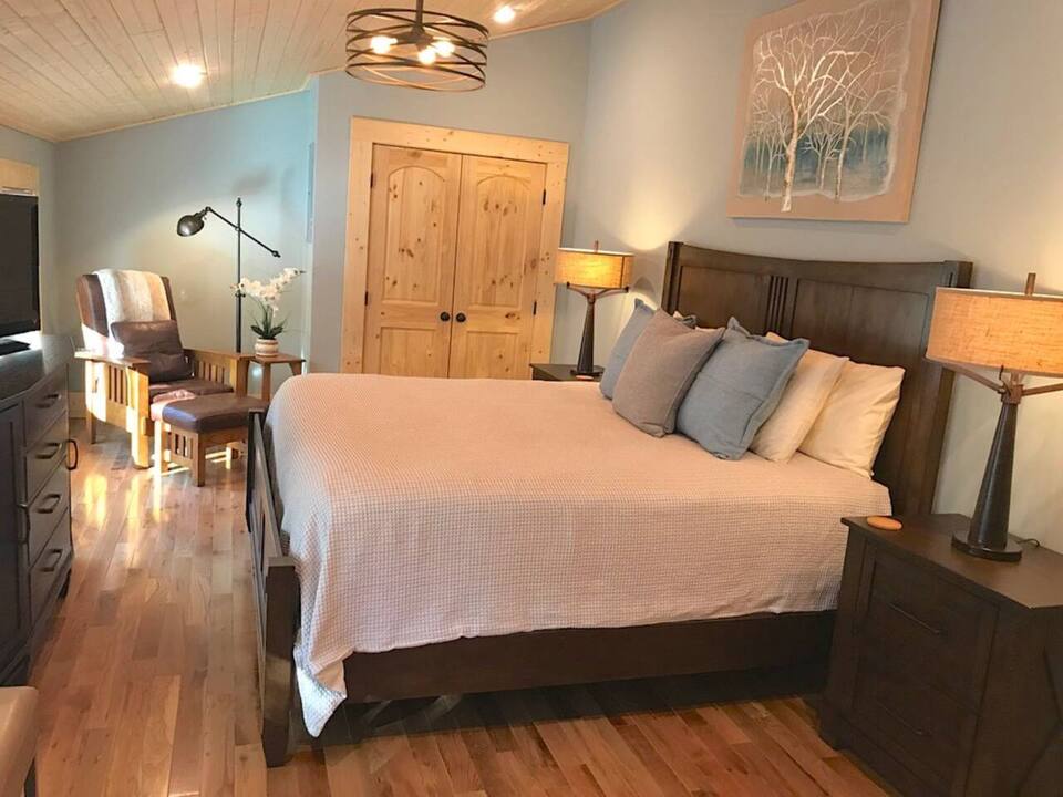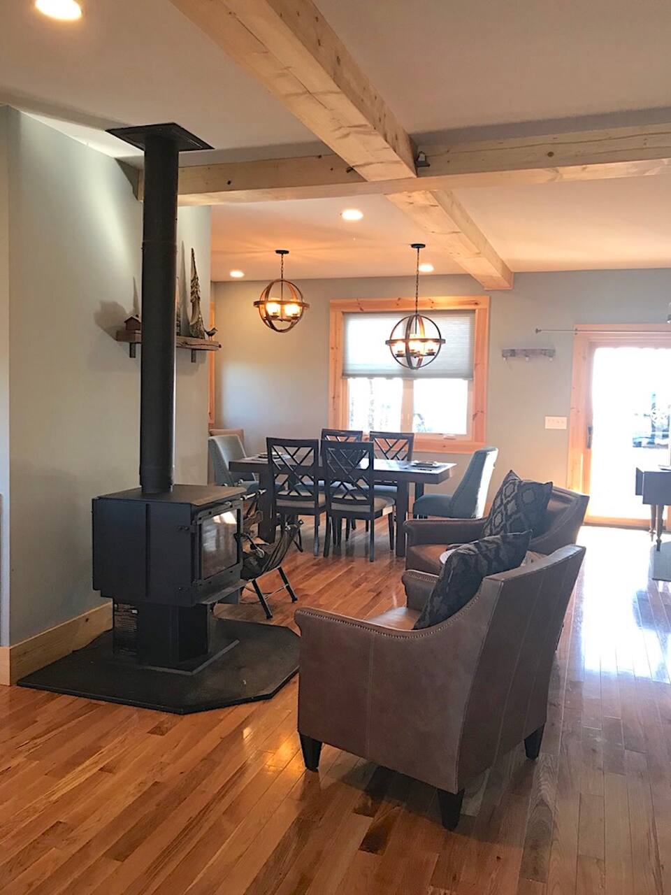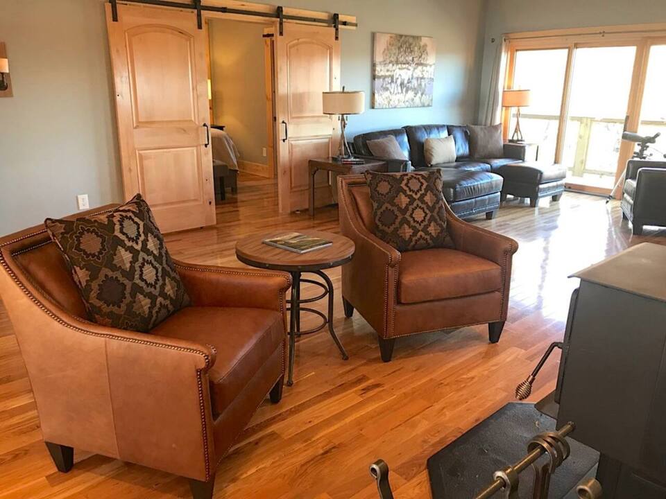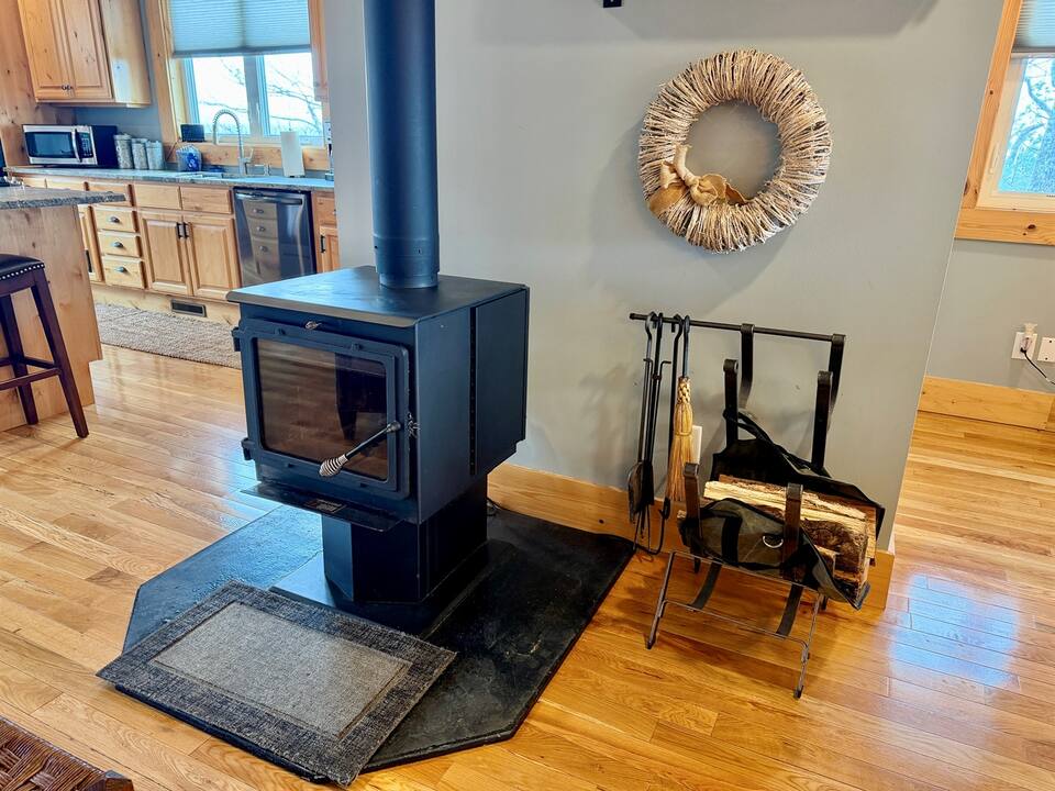Relax in front of the real log burning stove on a leather sectional and chairs on the main floor. Entertaining is easy with the open dining and kitchen spaces. It has a Professional, large kitchen with an Island and granite counter tops. The kitchen is fully stocked and has everything that you need. The dining room sits 6 people plus the nearby island will sit an additional 4 people. There is a free standing bar that is fully equipped to store wine and liquors in order to entertain. It’s a great place for family dinners and holiday gatherings.