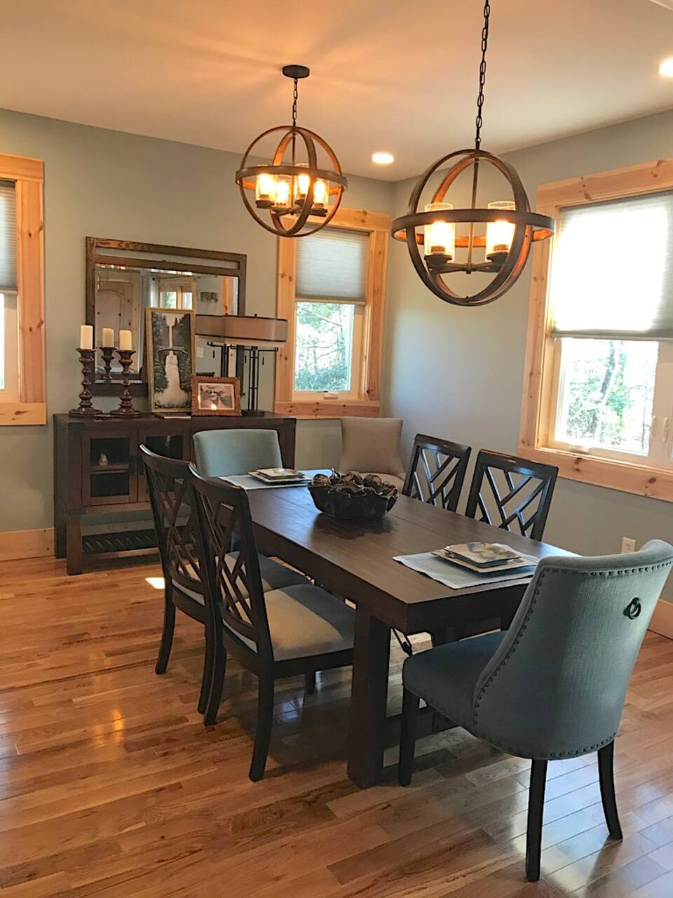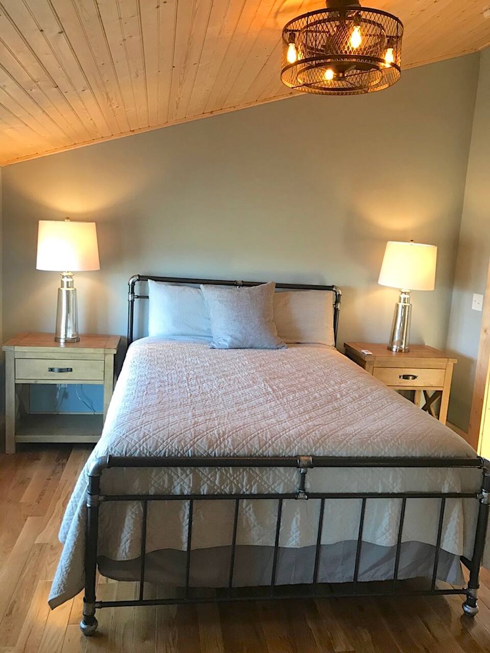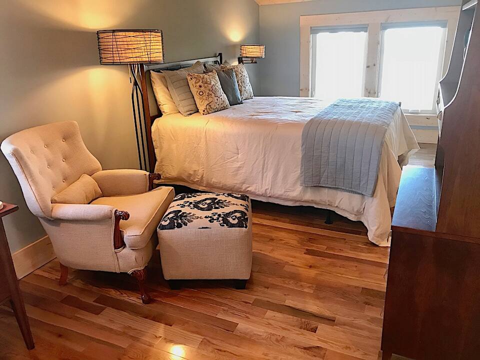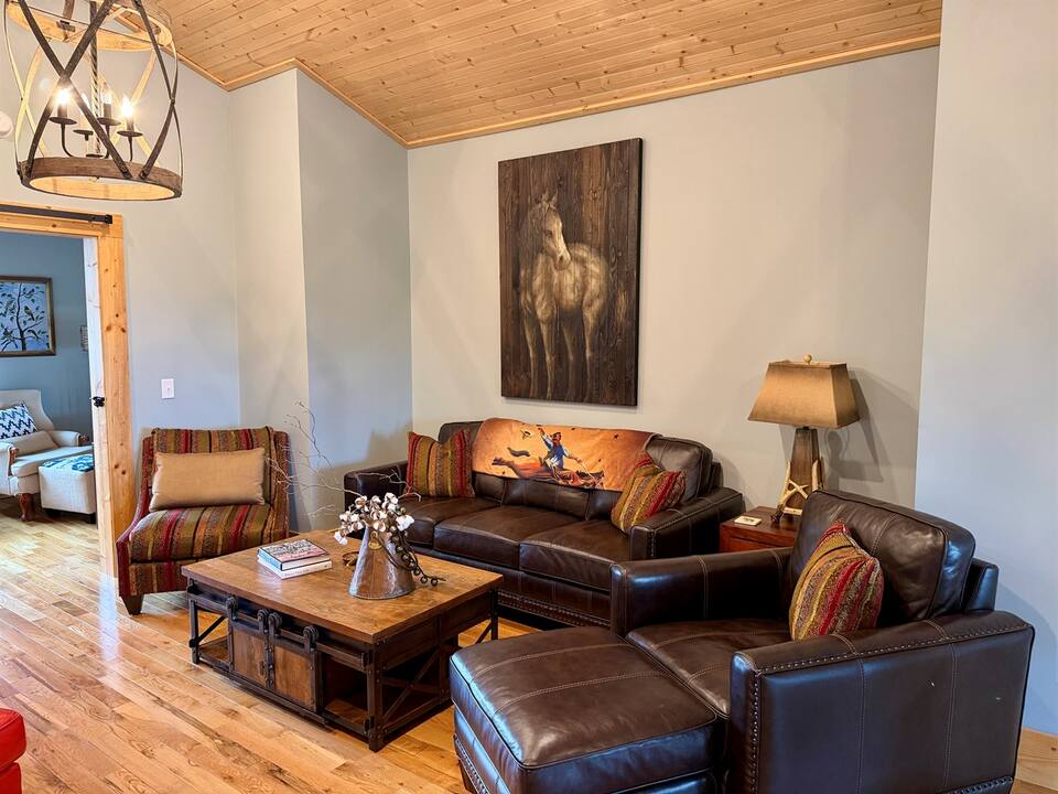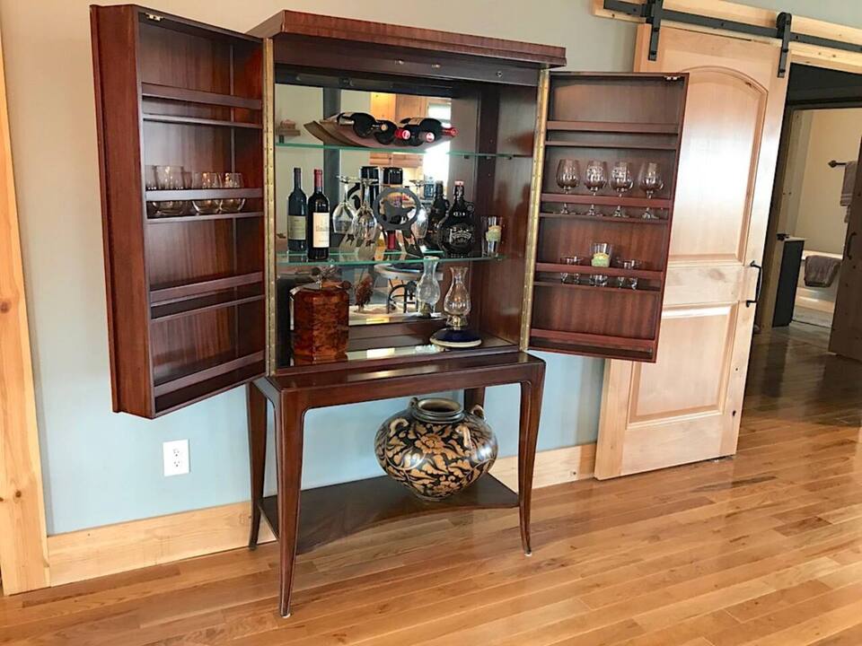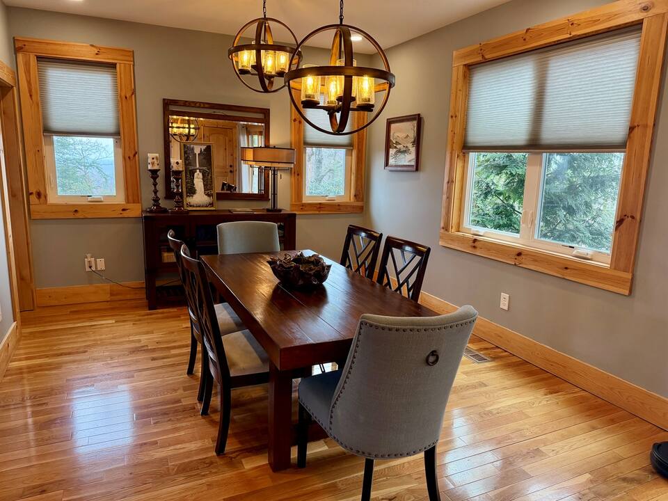 Relax in front of the real log burning stove on a leather sectional and chairs on the main floor. Entertaining is easy with the open dining and kitchen spaces. It has a Professional, large kitchen with an Island and granite counter tops. The kitchen is fully stocked and has everything that you need. The dining room sits 6 people plus the nearby island will sit an additional 4 people. There is a free standing bar that is fully equipped to store wine and liquors in order to entertain. It’s a great place for family dinners and holiday gatherings.