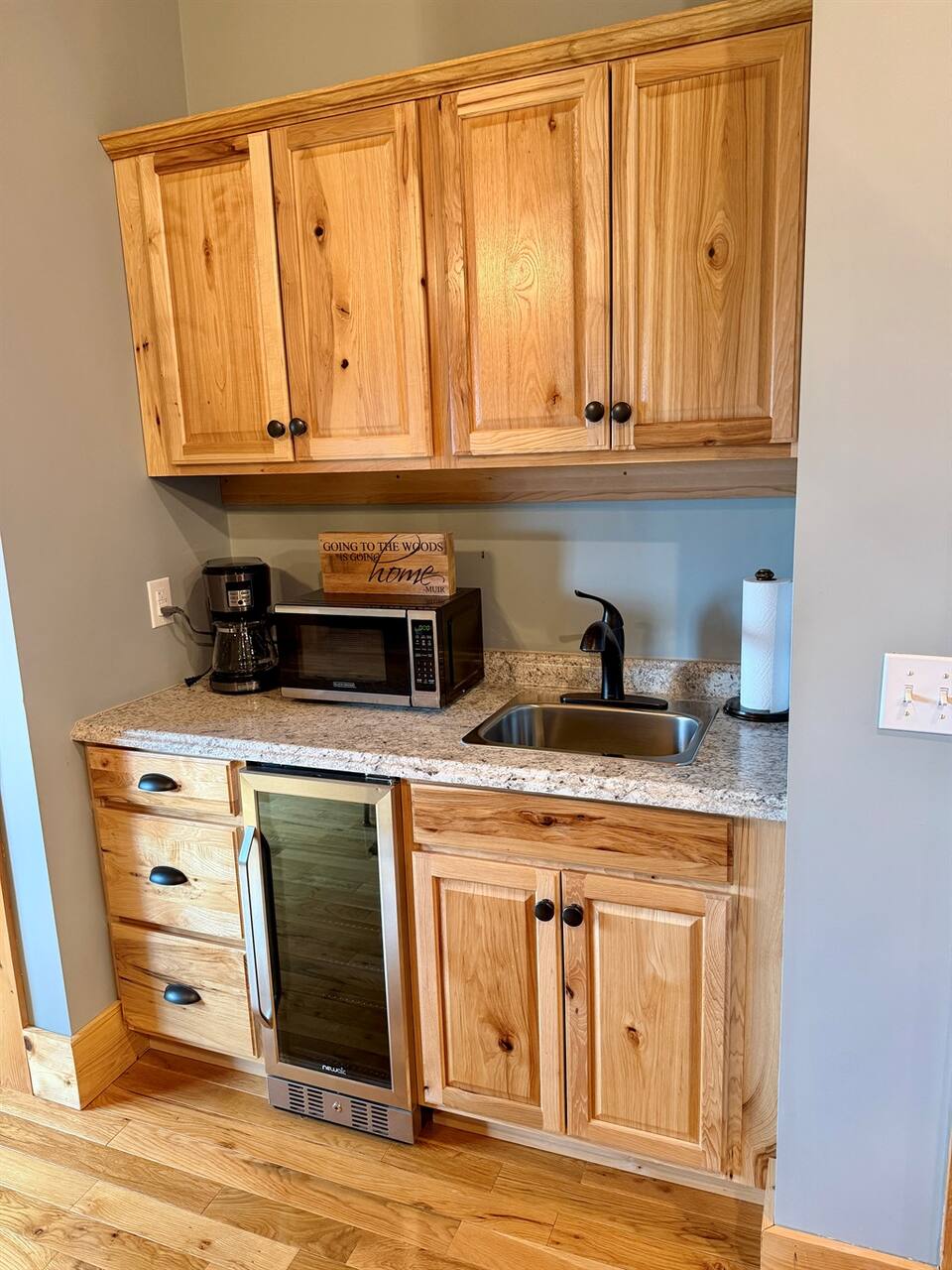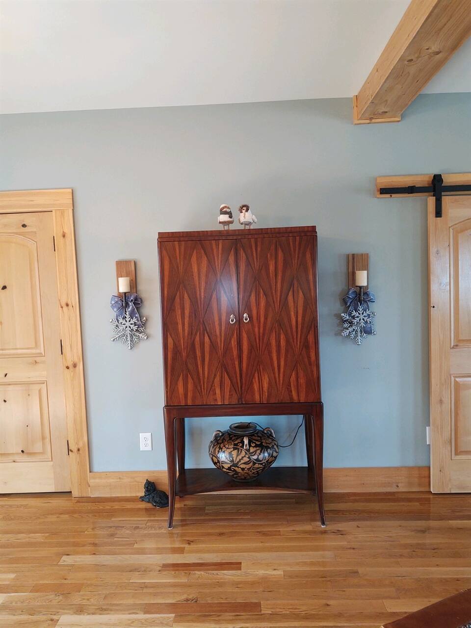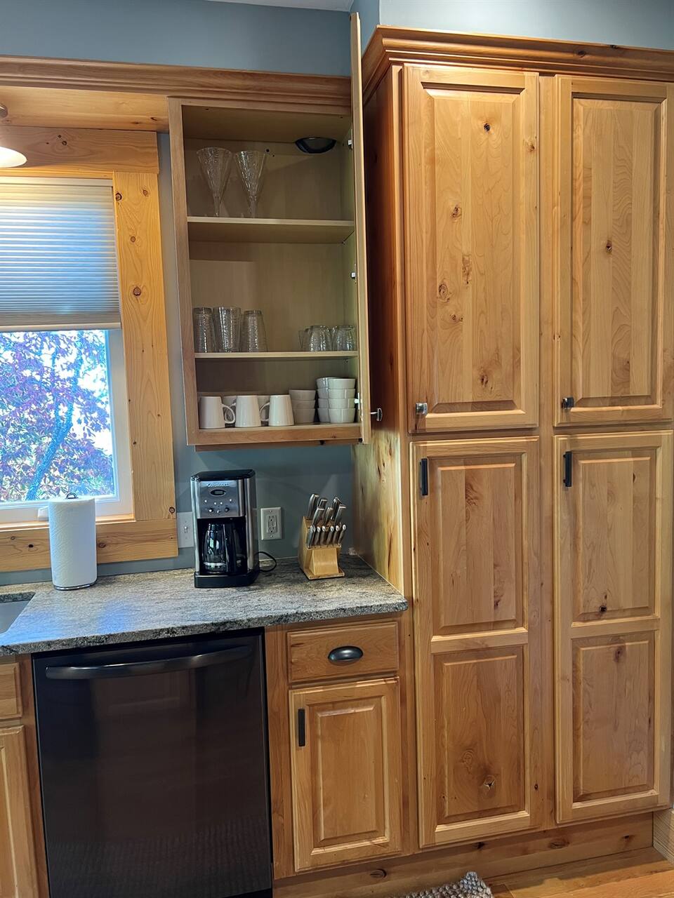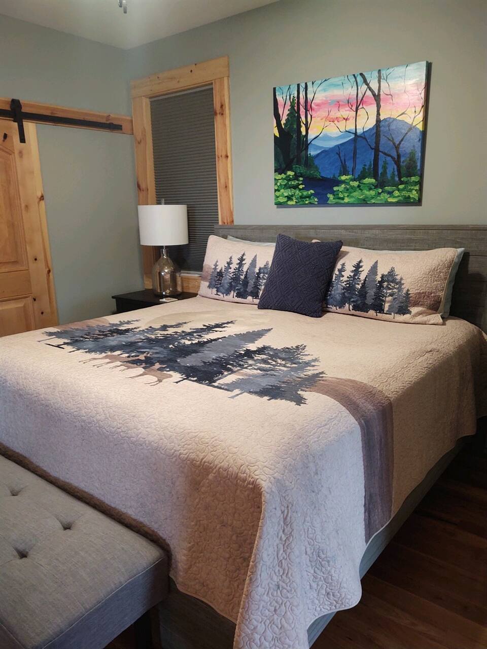 Relax in front of the real log burning stove on a leather sectional and chairs on the main floor. Entertaining is easy with the open dining and kitchen spaces. It has a Professional, large kitchen with an Island and granite counter tops. The kitchen is fully stocked and has everything that you need. The dining room sits 6 people plus the nearby island will sit an additional 4 people. There is a free standing bar that is fully equipped to store wine and liquors in order to entertain. It’s a great place for family dinners and holiday gatherings.