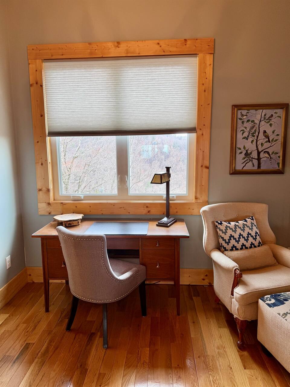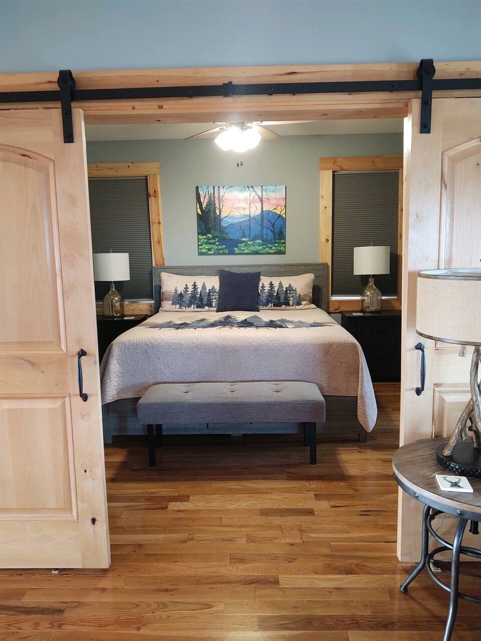 The house is perfect for four couples or a family.There are two Master bedrooms, one on each floor. They both have adjoining baths. Upstairs there are two additional queen size bedrooms that share a Jack and Jill bath with their own separate entrances. One of the guest bedrooms upstairs has a wonderful desk area that over looks the mountains where you can work. Working from home has never been easier with separate areas to work from. The Upstairs has a true Treehouse experience with multiple windows overlooking the vast views. Relax and watch the game in the upper living room or share a snack at the little kitchenette area and play cards or do a puzzle on the gathering table. The upper floor has multiple uses and has great flexibility. With a little adjustment you can find your yoga mats a spot and overlook the views.